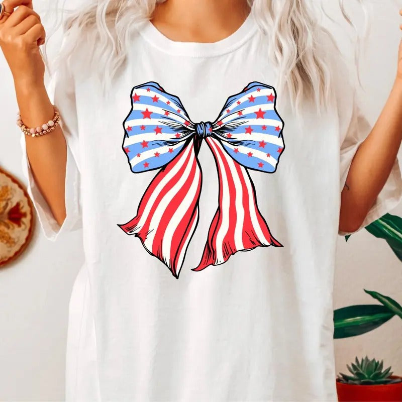 AMERICAN FLAG BOW SHIRT, 4TH OF JULY SHIRT, JULY 4TH SHIRT UNISEX COTTON SHIRT, OVERSIZED HOLIDAY SUMMER SHIRT Fabric,