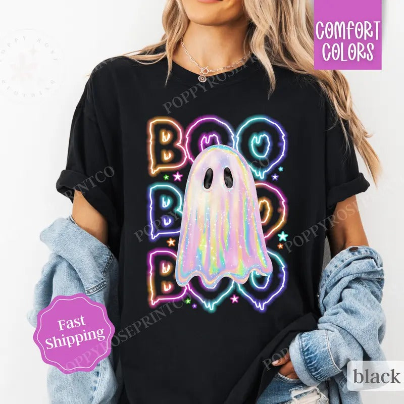 BOO Ghost Neon Shirt Comfort Colors Halloween Tshirt, Women's Holiday Tee