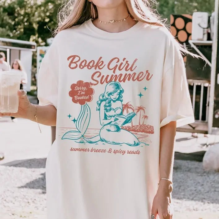 Book Girl Summer Shirt, Bookish Mermaid Shirt for Book Lovers, Funny Reader Preppy Vacation Shirt, Romantasy Ocean Inspired Beachy Shirt