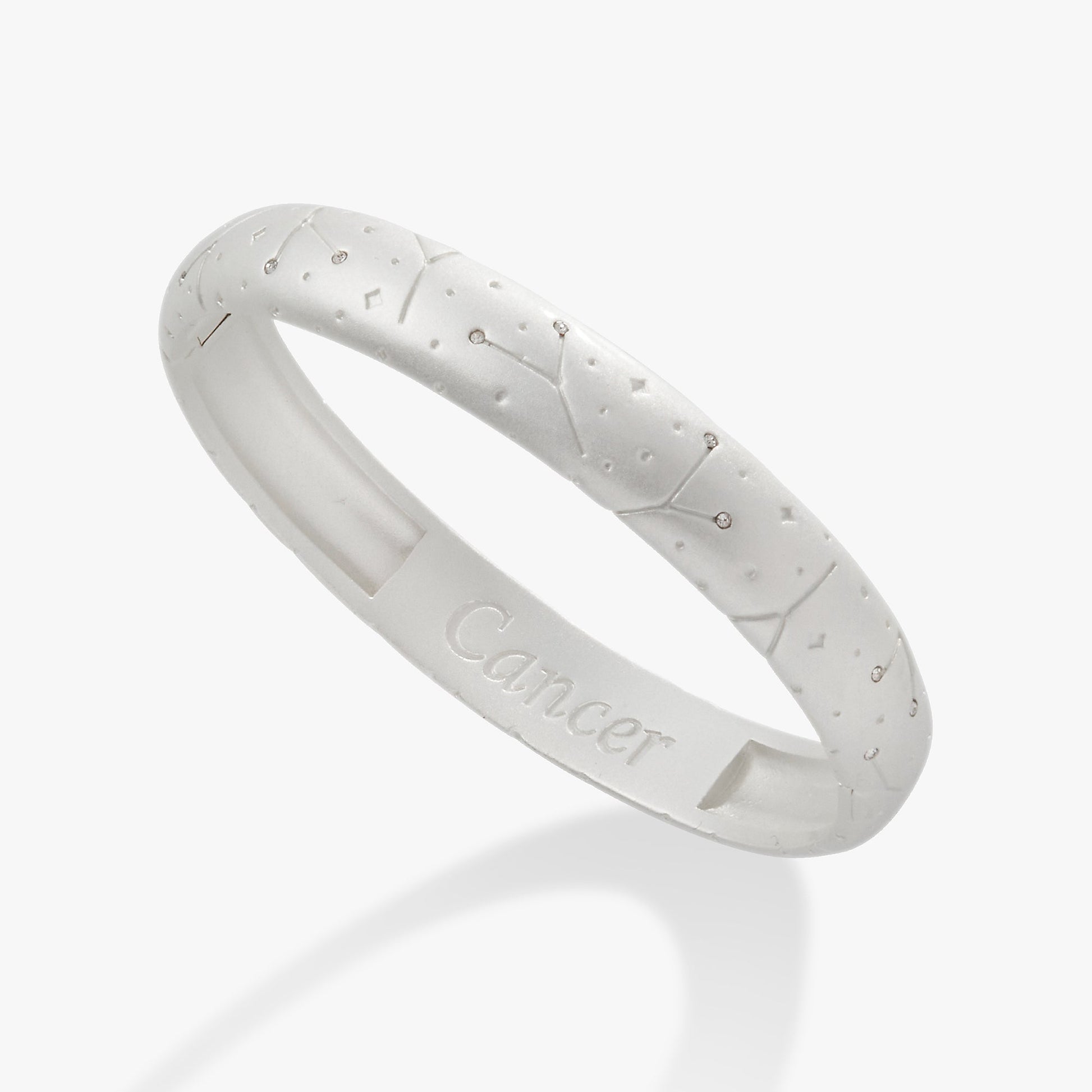 Embrace your Cancer pride with this satin finish hinge bangle. Featuring an interior "Cancer" engraving, the bracelet is adorned with the sign's constellation and shimmering crystals for a subtle yet beautiful effect. A perfect way to show off your personality and style.