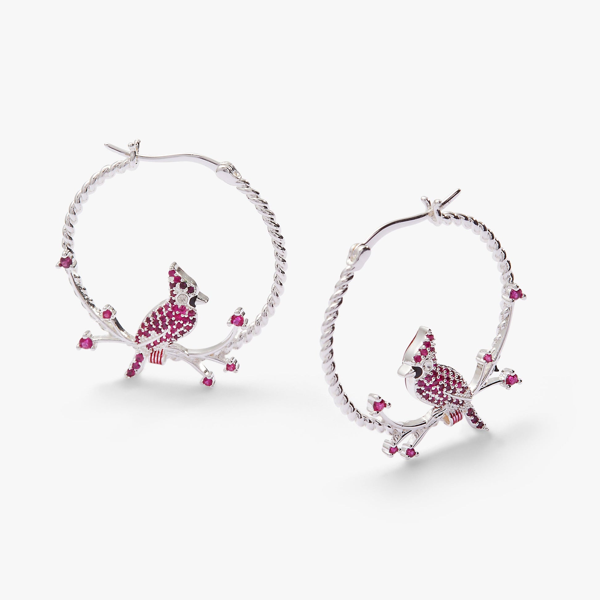 Cardinals are sacred symbols of devotion and loving relationships, in this world and beyond. These cardinal hoop earrings feature clear and ruby crystal-accented enamel cardinal charms sitting on branches inside braided hoops. Reversible in design, they can be worn in two ways, offering versatile styling while serving as a reminder of endless love.