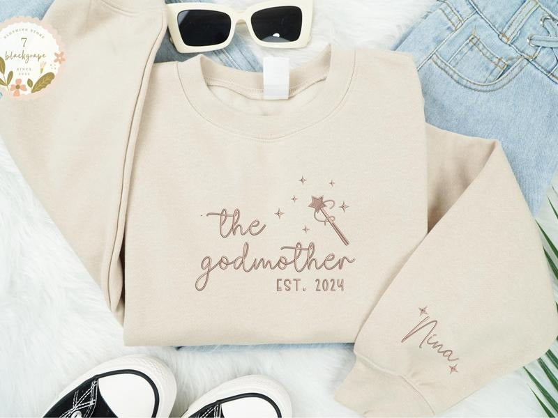 Embroidered Godmother With Kid Names Sweatshirt, God Mother Est Sweatshirt, Godmother Proposal Crewneck
