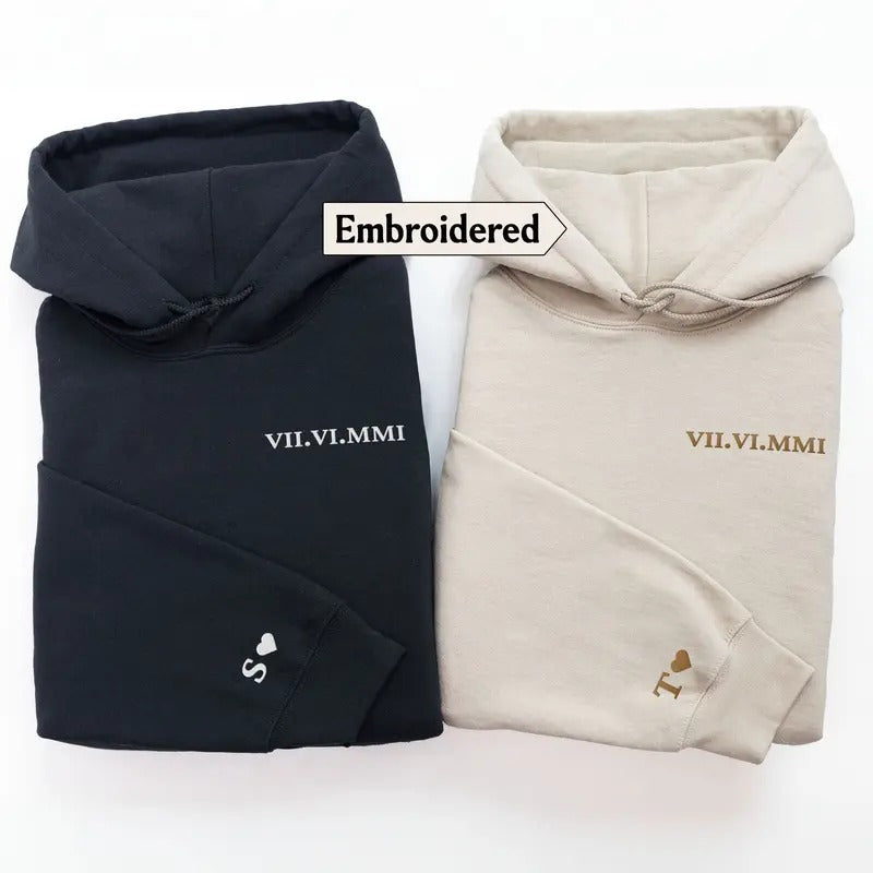 Embroidered Roman Numeral Valentine's Day Hoodie, Personalized Date Sweatshirt, Matching Couple Hoodies, Romantic Valentine's Sweatshirts