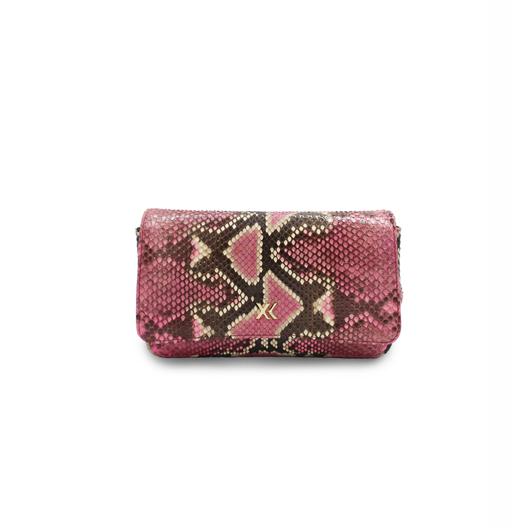 The Enzo is an exquisite baguette clutch crafted from luxurious, colored python skin. It features a metallic XK monogram, a concealed magnetic snap closure and a detachable gold chain. Inside, you'll find a compartment lined with dark suede, a large zipper pocket on the back, and a small open pocket for important documents on the front. Made in Italy from responsibly sourced python, the Enzo is a lightweight, stylish and functional accessory that offers both elegance and practicality.