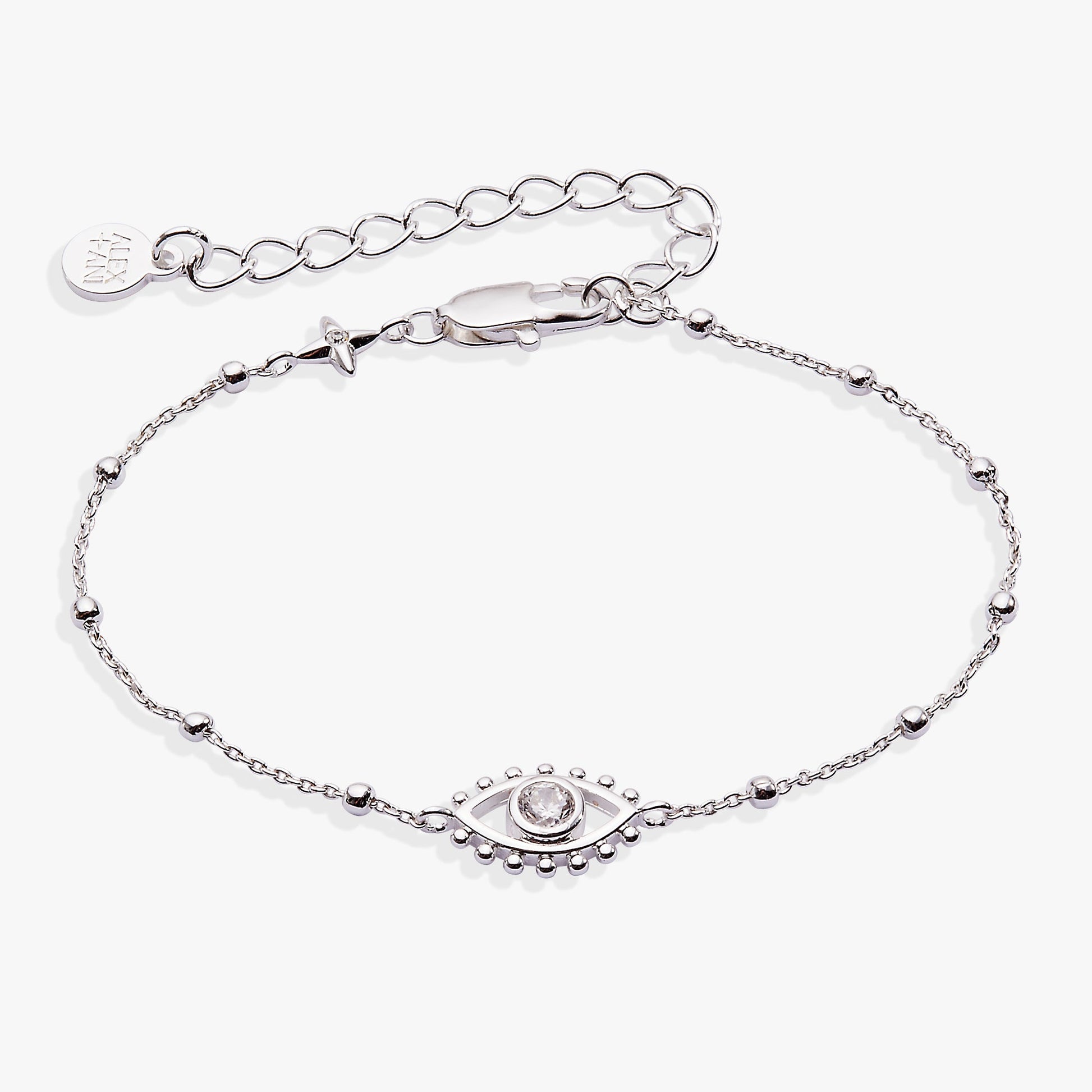Get ready to turn heads with the Evil Eye Inline Bracelet, your new go-to piece for adding a dash of sparkle and substance to any wrist. This playful bracelet features a silver-plated beaded metal chain paired with an eye-catching openwork evil eye charm station, complete with a brilliant clear crystal center stone that gleams with every movement. Rooted in timeless symbolism, evil eyes represent strength and protectionโmaking this bracelet the perfect companion for anyone seeking a little extra good vibes. Part of our 12 days of gifting collection, this style draws inspiration from our most beloved symbols. Stack it with your favorite bracelets for a curated look, or let it command attention as a standalone statement piece. Either way, you're covered with style and intention.