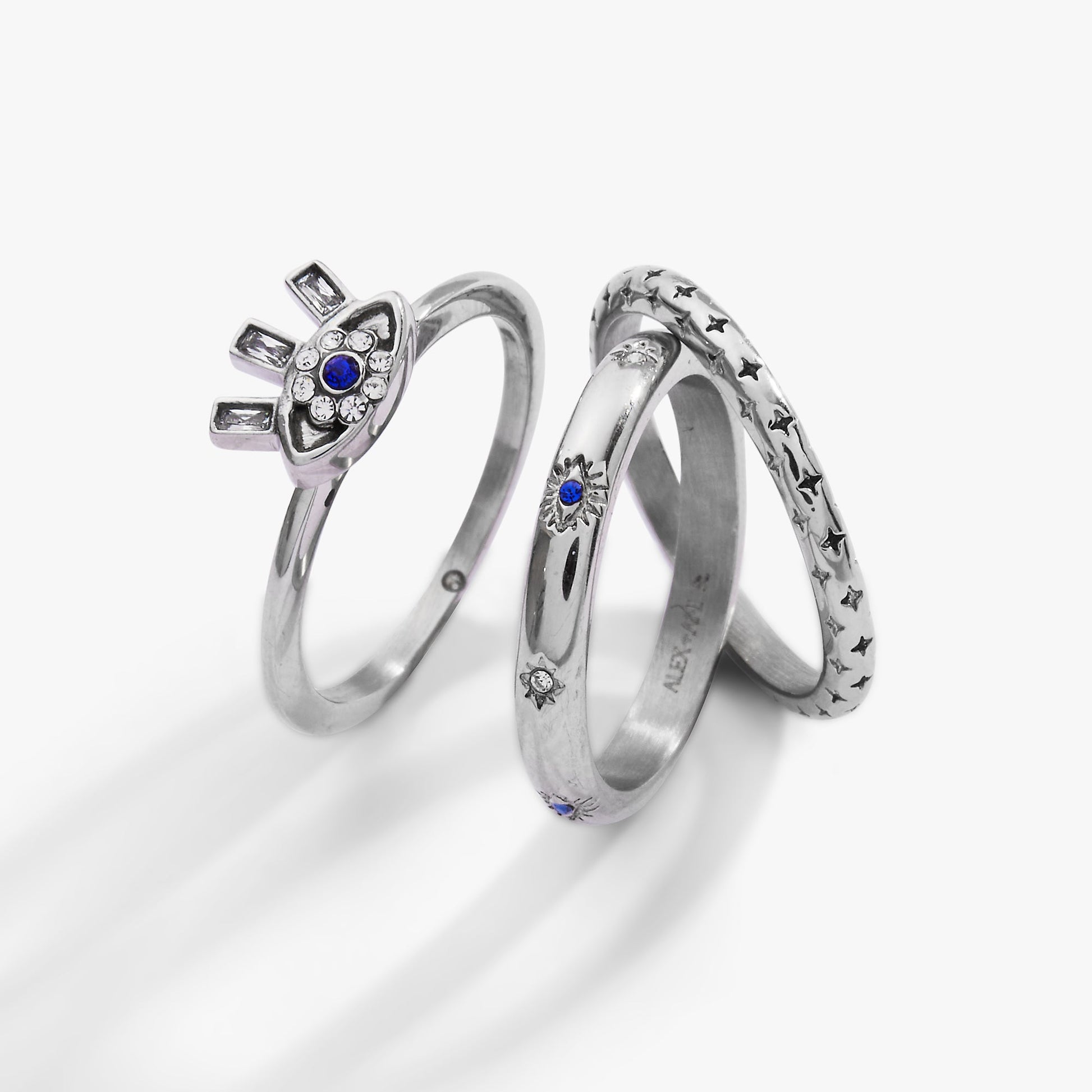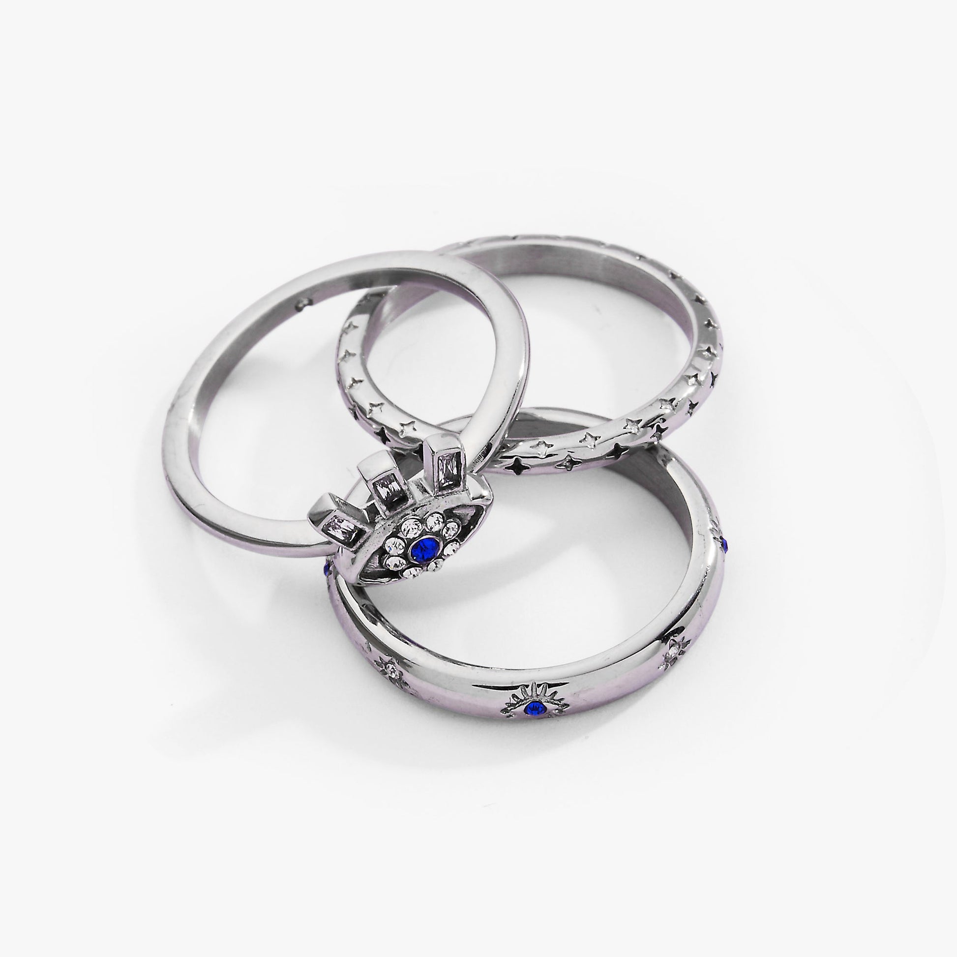 This playful set includes three stackable rings inspired by the protective evil eye. The top ring features a delicate star pattern etched on a slim rounded band. One shines with clear crystal baguette stones set in a pave evil eye design on a sleek gold band, perfectly nesting atop two coordinating bands, while the other alternates evil eyes and stars adorned with clear crystals and sapphires. Wear this sparkling trio for a trendy look thatโs as meaningful as it is fun, symbolizing strength and protection.