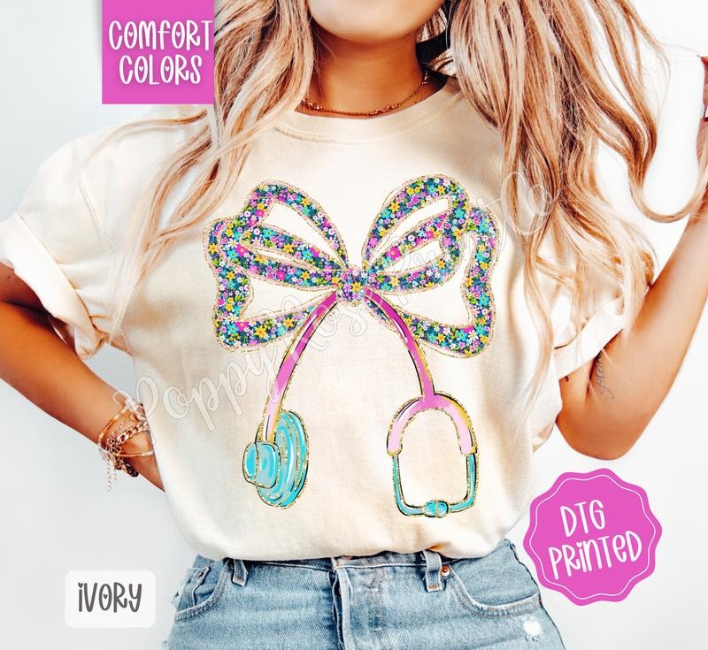 Floral Stethoscope Bow Comfort Colors Shirt, Cute Nurse Tshirt, Women's Tee, Gift for Her