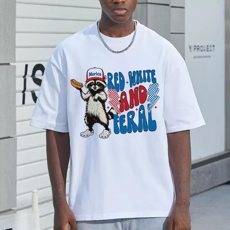 Funny Graphic Racoon Red White And Feral Tshirt, USA 4th Of July Party Tee, Hotdog Raccoon Merica Independence Day Gifts Unisex T-Shirt