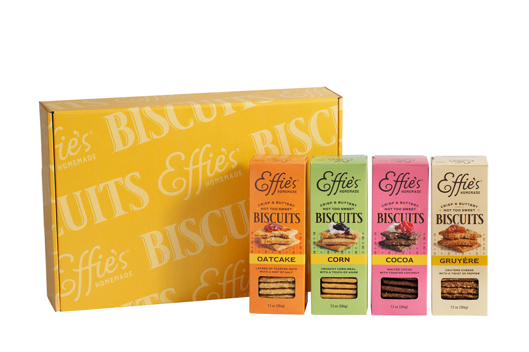Share the joy of Effie’s Homemade with our Sweet and Savory Sampler Gift Box. Featuring four favorites: Oatcakes, Corn Biscuits, Cocoa Biscuits, and Gruyère Biscuits. Each biscuit is crisp, buttery, and not too sweet. Perfect for pairing, sharing, and savoring! Whether it’s a holiday, birthday, thank-you, or “just because,” this sampler makes a thoughtful gift for friends, family, or anyone who deserves a little extra treat.