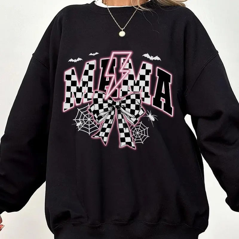 Girl Mom Halloween Shirt, Mama Halloween Sweatshirt, Mom for Girls Comfort Tee, Halloween Shirts For Mom, Retro Halloween Shirt, Spooky Vibes Shirt, Spooky Season, Mom Coquette Halloween, Checkered Mama Halloween Tee