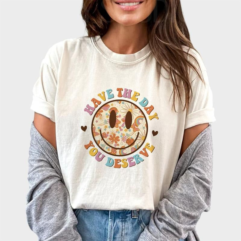 Have The Day You Deserve Shirt, Funny Karma Unhinged Shirt, Positive Vibes Graphic Printed Tee, Retro Happy Face Motivational T-shirt, Comfy Fabric Graphic Tee, Women's Tops, Womenswear, Cotton Fabric Relaxed Fit Chic Style