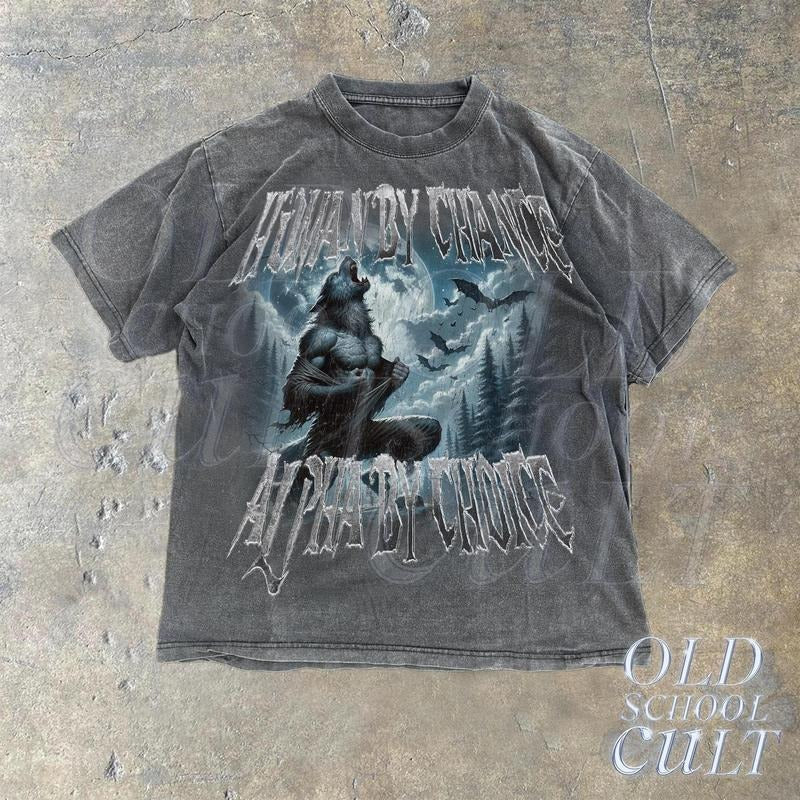 Human By Chance Alpha By Choice Wolf Shirt, Vintage 90s Style Werewolf Shirt, Wolf Emo Meme Shirts, Mental Health Shirt, Wolf Sigma, Goth