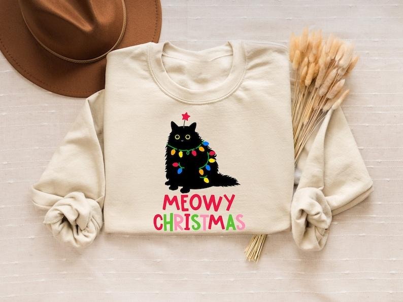 Meowy Christmas Shirt, Cat Christmas Sweatshirt, Cat Lover Xmas T-Shirt, Christmas Cat Mom Sweater, Catmas Gift For New Year, Xmas Crewneck, Hoodie and Sweater; T-shirt Cotton Menswear