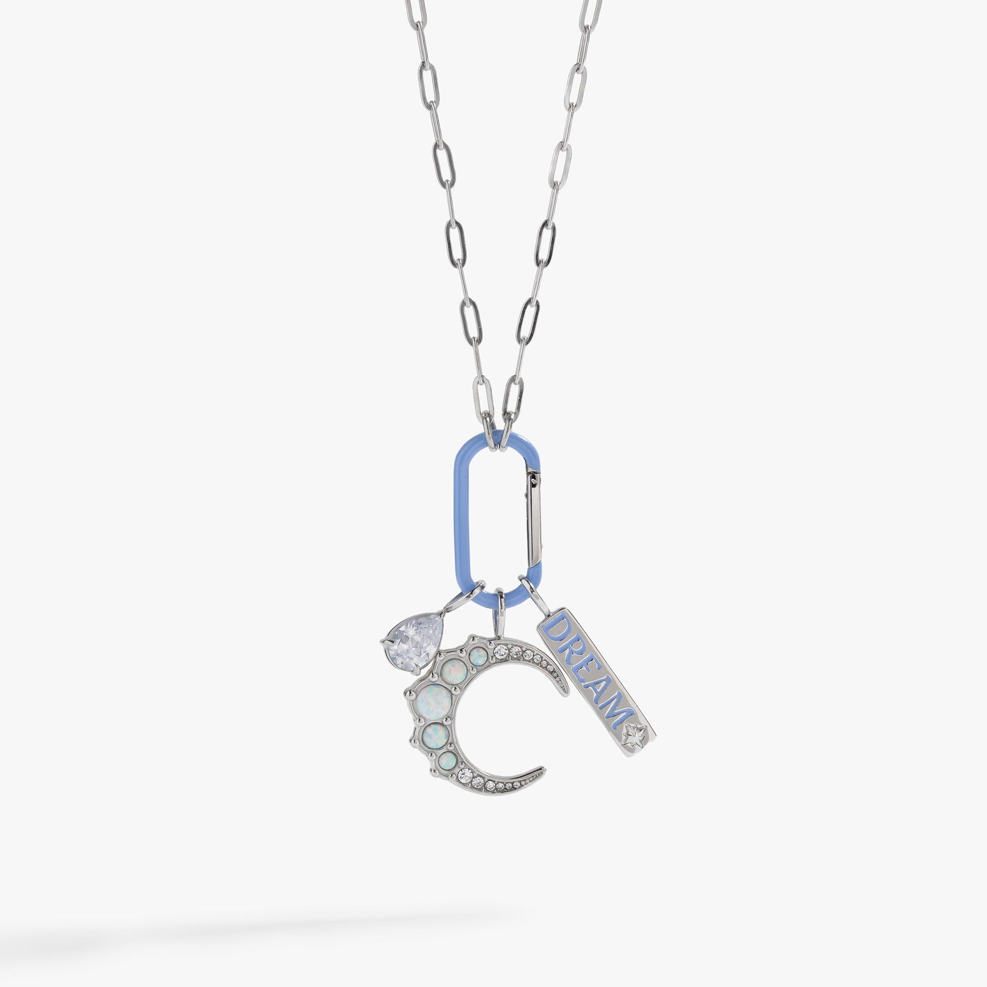 Channel celestial wisdom with the Moon Dream Interchangeable Charm Necklace featuring a faux opal-accented crescent moon pendant, a diamond dupe CZ charm, and a bar charm engraved with “DREAM” on a blue enamel carabiner. Our new, interchangeable necklace design lets you make the look all your own: swap out the charms, or add more symbols, to make a charm necklace that’s exactly your style. Crafted to be worn every day, this stainless steel necklace is tarnish-resistant, so you can feel confident when you wear it on repeat.