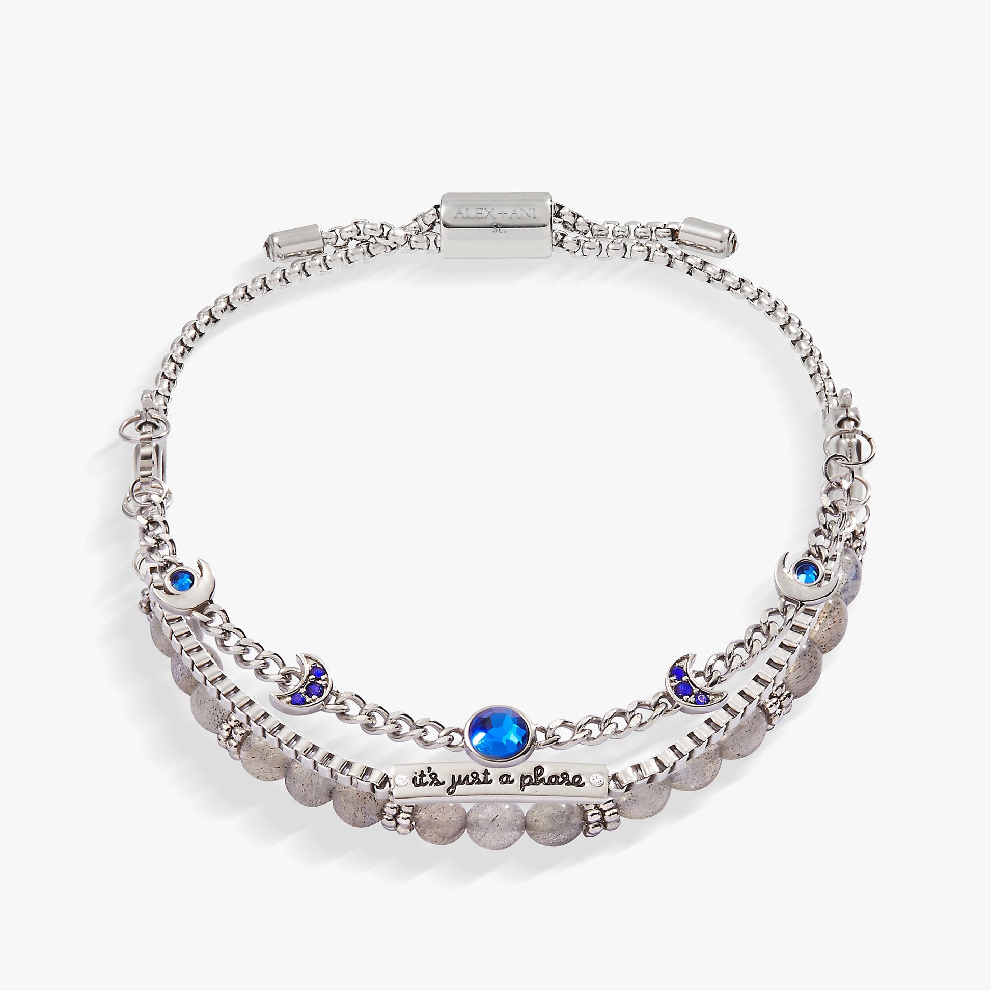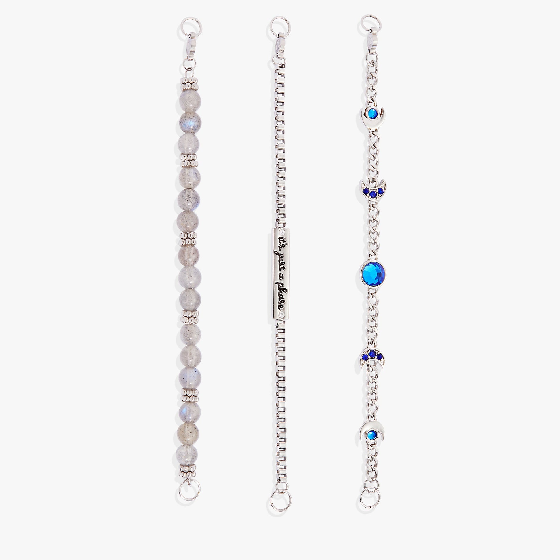 Wear symbols of intuition and wisdom with this Stranded™ Moon Phase Bracelet Set, which features three bracelet strands. One has an in-line plate that says “It’s just a phase” accented with cubic zirconia, one has in-line cubic zirconia-accented charms representing the phases of the moon, and one has genuine Blue Labradorite beads, believed to help enhance psychic gifts. The Stranded™ Collection features an all new, interchangeable design. Bracelet strands attach to an adjustable-length keeper, included with the set. Swap out strands from different pieces and combine them to make a style that’s all your own.