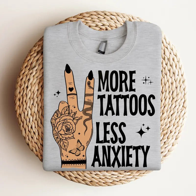More Tattoos, Less Anxiety - Crewneck Sweatshirt, Tattoo Lover, Bright Graphic, Fun Apparel, Gift Idea, Relaxed Fit, Casual Apparel, Cute Top, Great with Jeans, All Seasons, Fun Style, Comfortable Shirt