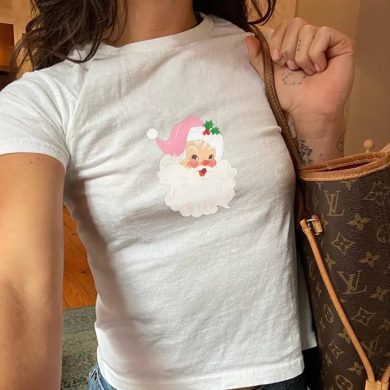 Retro Santa Claus Baby Tee Shirt for Women, Bold Graphic Tee for Holiday, XS-XL - Comfort, Casual Cotton Top
