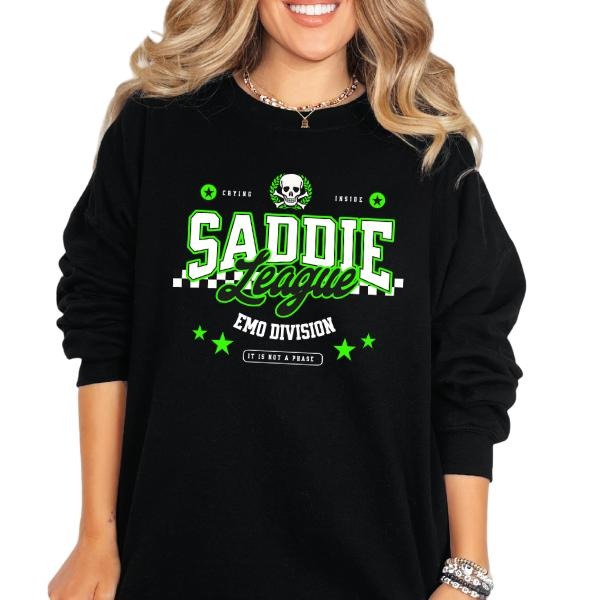 'Saddie Emo Division, It is not a Phase' Sweatshirt, T Shirt, or Hoodie | Vintage Grunge Aesthetic Pullover w/Skulls, Retro Vibes | Saddie League