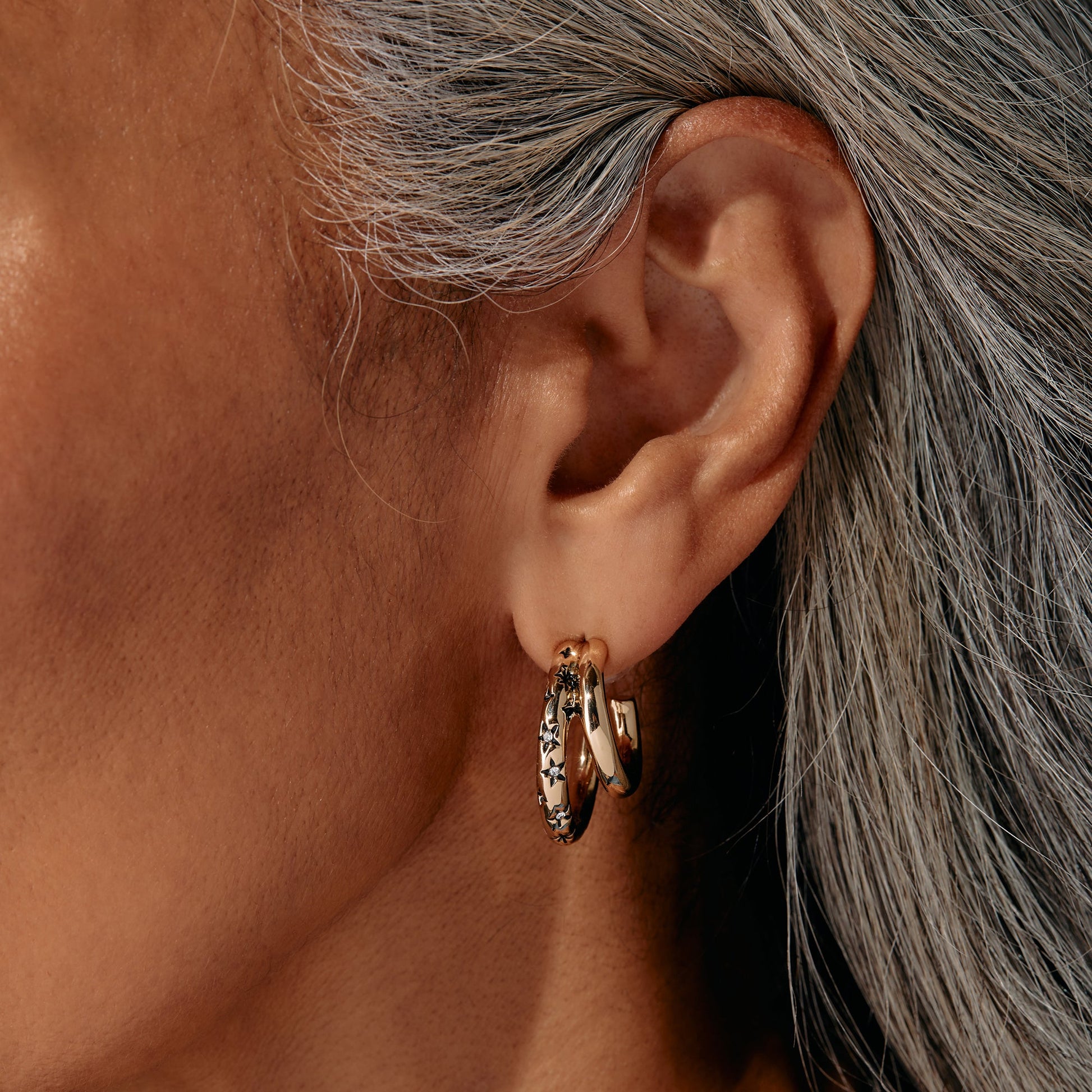 The star is a guiding light that energizes and heals. It holds the power to brighten even the darkest of skies. The Stargazer Double Hoop Earrings are a reminder to look for the power to brighten the world around you, within you. These hoops are finished in a shiny gold tone: one is solid, and one features cubic zirconia crystal stars throughout. Wear this jewelry box staple with any OOTD that needs a little sparkle and shine.