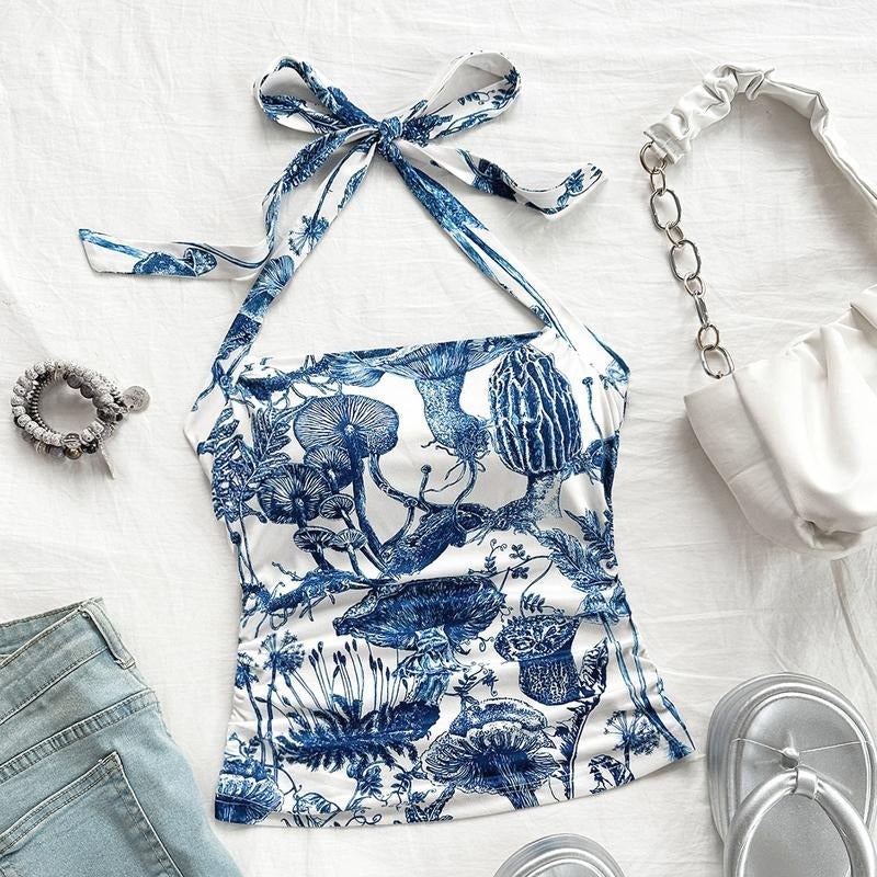 TikTokShopBacktoSchool Tie Halter Neck Ruched Top Backless Slim Fit Summer Vacation Crop Top