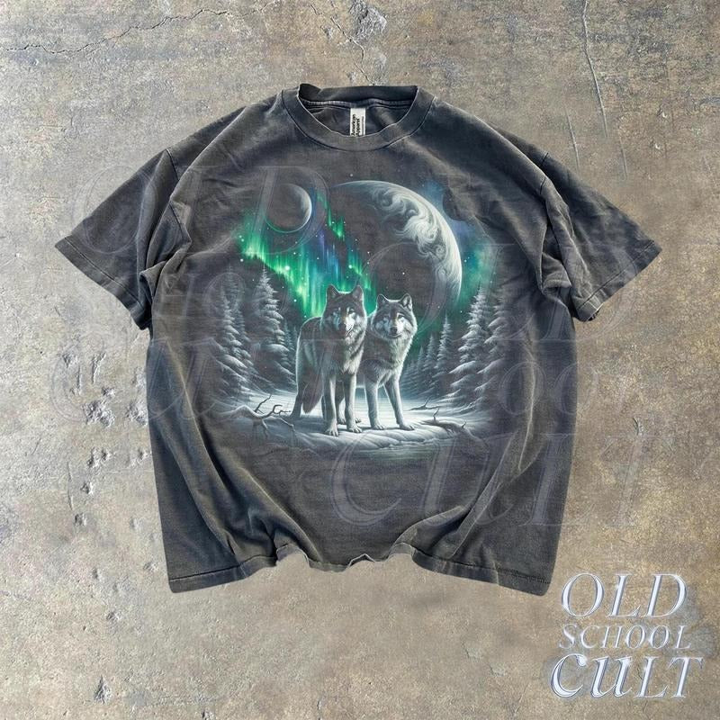 Two Wolf Vintage Halftone Graphic Shirt, Wolf Lovers Retro Tee, 2000s Nature Polar Lights Shirt, Mystical Unisex Oversize Tee,Cute Wolf Tee