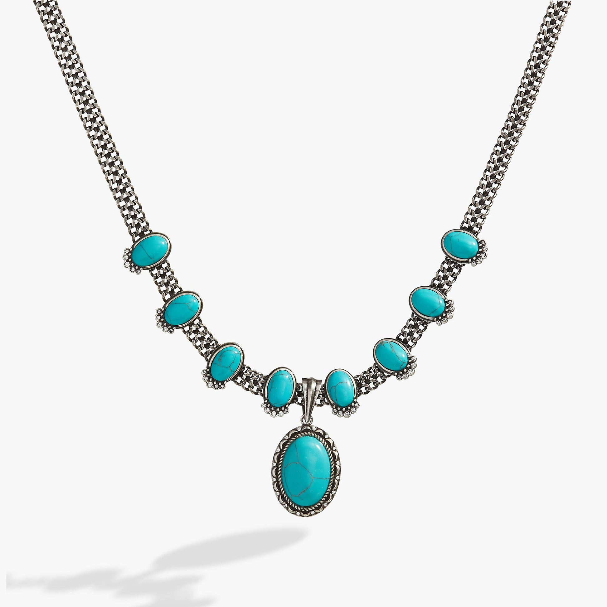 You were not made to be subtle. Crafted from a thick antiqued silver-tone chain with turquoise-colored stones throughout, this western-inspired necklace is completed with a removable turquoise-colored stone centerpiece framed in a rope-like texture with crescent moon detailing. Embody the confidence of centuries of women being empowered by this powerful stone. The magic of turquoise is found in its ability to seamlessly fit into any look for any season.