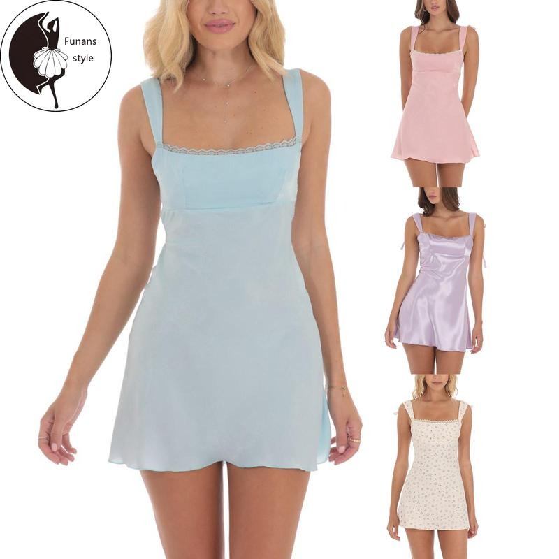 Women Sleeveless Satin Dress Summer Casual Lace Trim Tie up Straps Backless A-Line Mini Party Dress for Streetwear