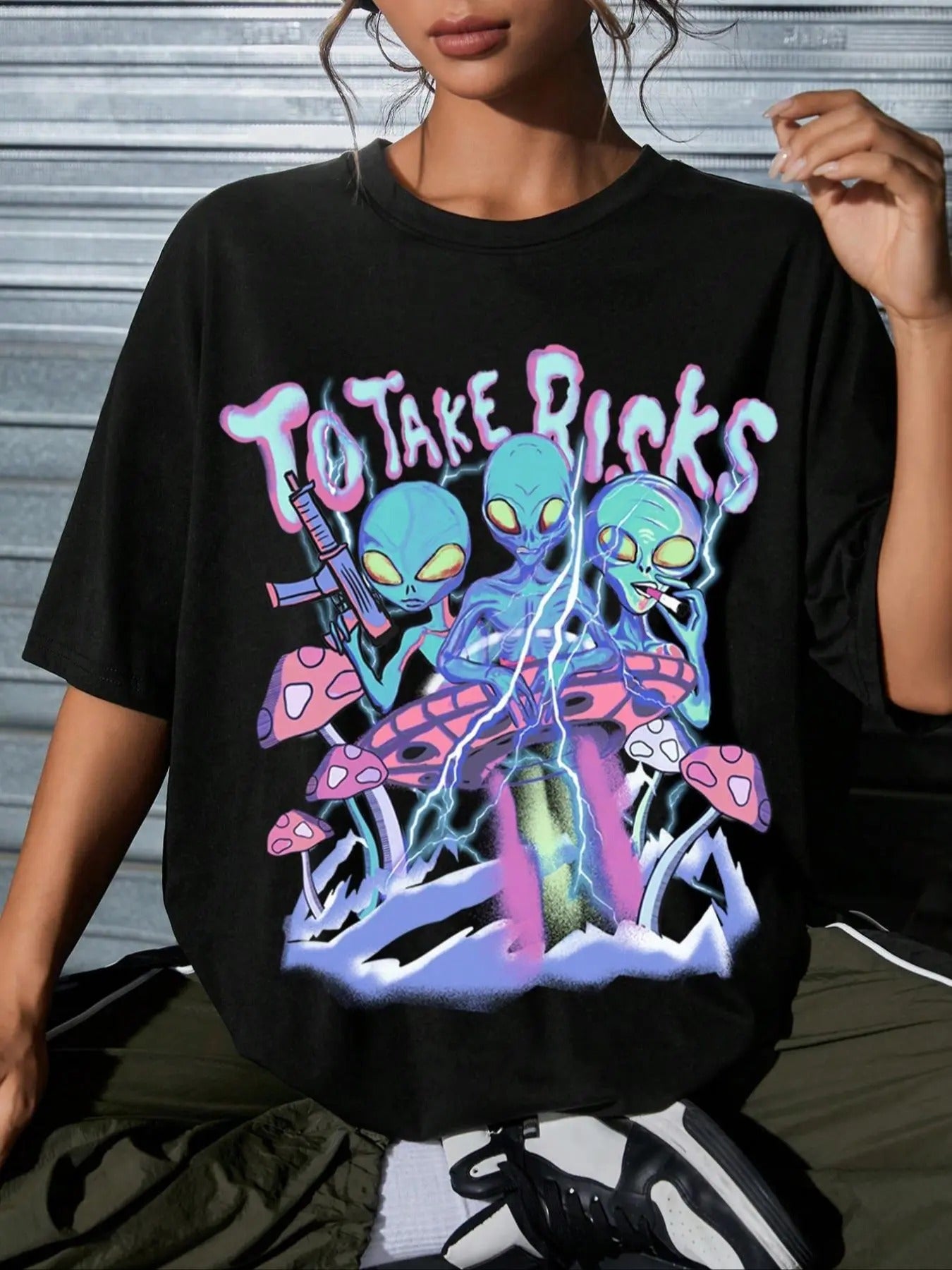 Women's Alien & Mushroom Print Drop Shoulder Tee, Fashion Casual Letter Graphic Crew Neck T-shirt for Daily Holiday Outdoor Wear, Ladies Clothes for Summer