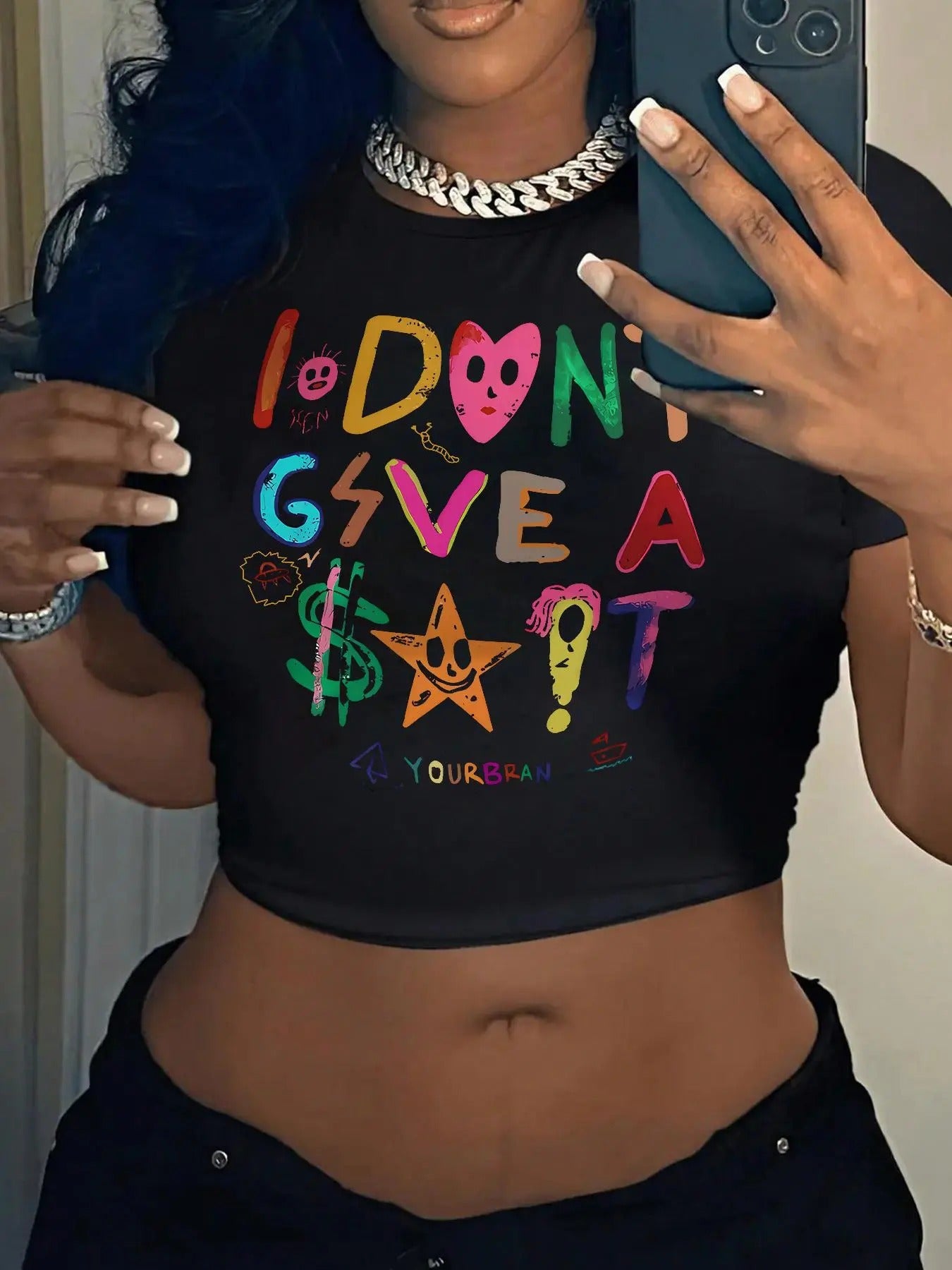 Women's Cartoon Letter Print Round Neck Short Sleeve Crop Tee, Fashion Casual Crew Neck T-shirt for Daily Holiday Vacation Outdoor Wear, Ladies Clothes for All Seasons