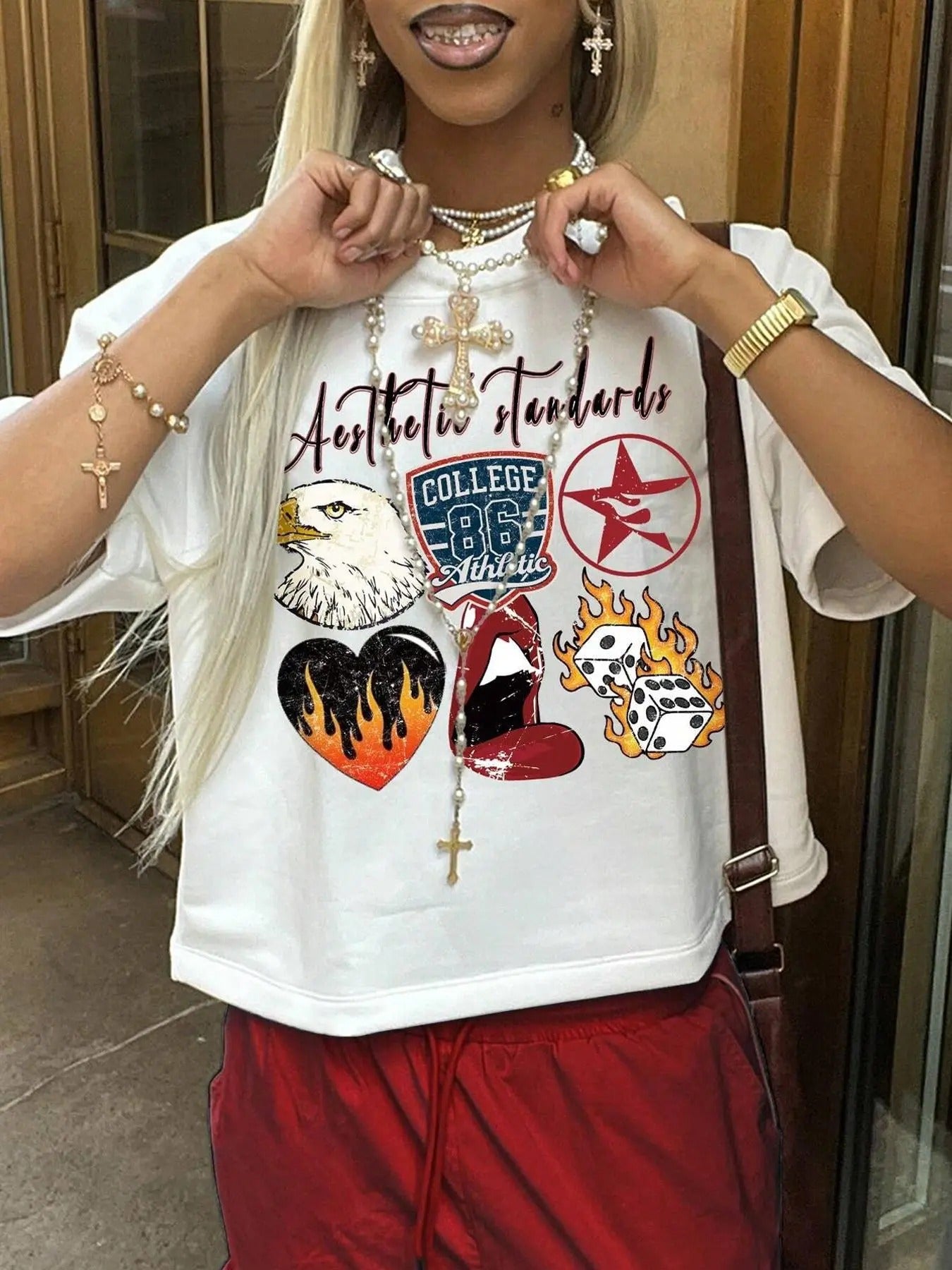 Women's Cartoon Print Drop Shoulder Tee, Fashion Casual Crew Neck T-Shirt for Daily Holiday Vacation Outdoor Wear, Ladies Clothes for Summerstyle{n002}2