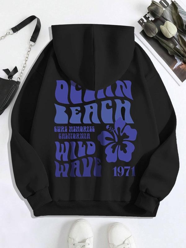 Women's Floral & Letter Print Drop Shoulder Hoodie, Fashion Casual Drawstring Pocket Hooded Sweatshirt for Daily Holiday Outdoor Wear, Women Clothing for Fall & Winterstyle{n002}2