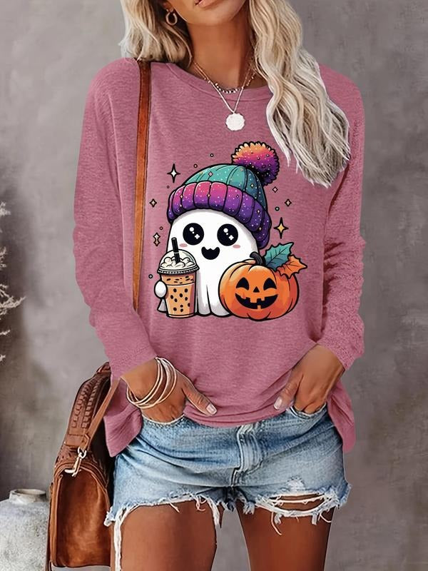 Women's Halloween Ghost Print Round Neck Tee, Casual Long Sleeve Crew Neck T-shirt for Fall & Winter, Women's Clothes for Daily Wear