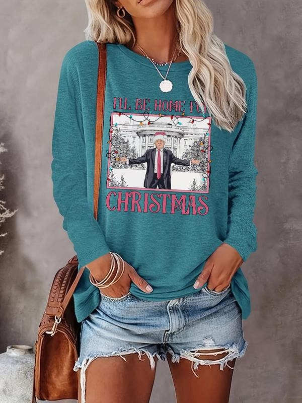 Women's "I'LL BE HOME FOR CHRISTMAS" Christmas Letter & Figure Print Round Neck Tee, Casual Long Sleeve Crew Neck T-Shirt for Fall & Winter, Women's Clothes for Daily Wearstyle{n002}2
