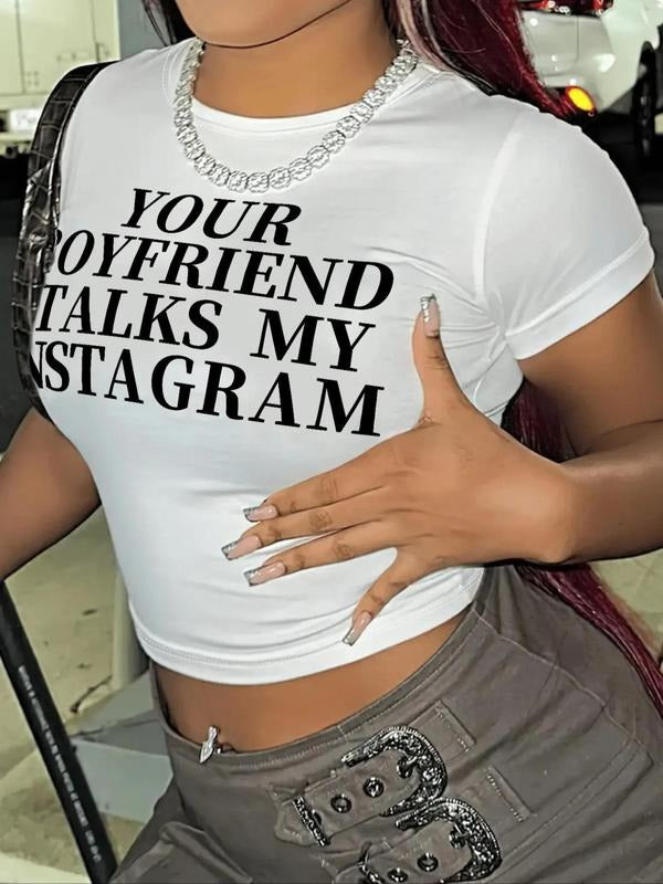 Women's Letter Print Round Neck Crop Tee, Fashion Casual Crew Neck Short Sleeve T-shirt for Daily Holiday Vacation Outdoor Wear, Ladies Clothes for All Seasons, Womenswear