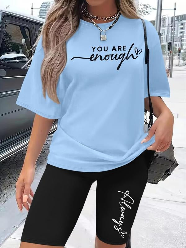 Women's Letter Print Short Sleeve Tee & Skinny Shorts Two-Piece Set, Casual Round Neck T-Shirt & Shorts, Ladies Clothes for Daily Wear