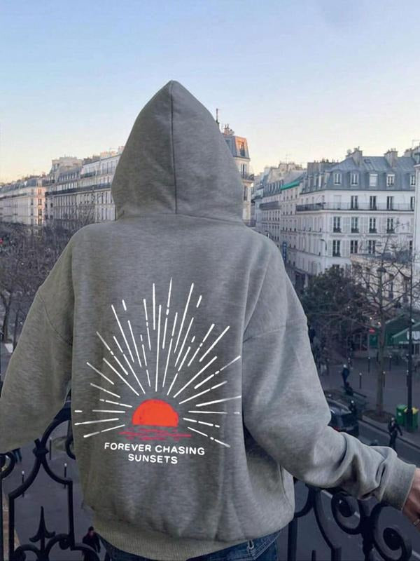 Women's Letter & Sun Print Drop Shoulder Hoodie, Fashion Casual Drawstring Pocket Hooded Sweatshirt for Daily Holiday Outdoor Wear, Women Clothing for Fall & Winter